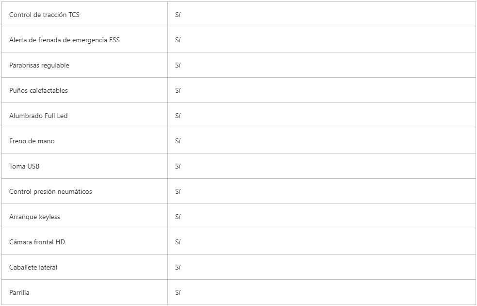 Garantías contratadas: Aseguradora Helvetia (Responsabilidad Civil Obligatoria, Defensa Jurídica) + Tim Yaya Pack básico (Abogado Personal, Gestión y Reclamación de multas, Teleconsulta médica, Servicio de información Mecánica Telefónica, Pérdida/Robo de llaves del vehículo, Seguro de Neumáticos: Reparación de pinchazos, Seguro de Neumáticos: Sustitución por reventón, Subsidio por hospitalización y Cobertura equipamiento del motorista)